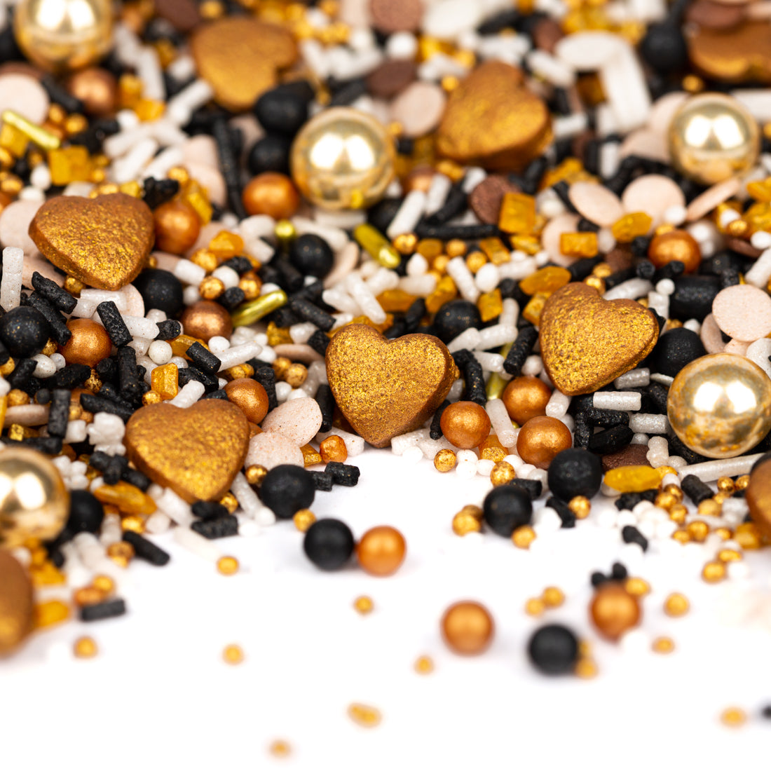 Il grande seduttore tra i nostri mix amorosi. Dovreste guardarvi da lui. È difficile resistere. Uno scintillio qui, un ammiccamento là, un sorriso malizioso e un cuore d'oro. In men che non si dica, Casanova lancia il suo dolce incantesimo su di voi e voi non potete sottrarvi. Casanova si trova particolarmente a suo agio con il cioccolato, che gli dona la carnagione. Palline e cuori di cioccolato dorati, coriandoli in crema e marrone. Inoltre, spruzzi di perline nere e bronzo e dolci spruzzi di cristallo. Beh, se questo non va dritto al cuore di cioccolato.