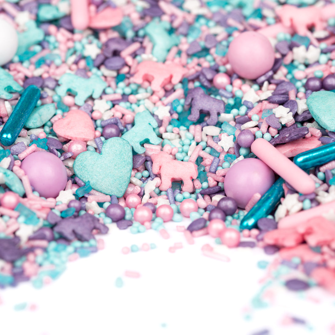 Siediti e rilassati: presentiamo con orgoglio i nostri unicorni!! Spruzzi di unicorno in questo sogno pastello di un mix di spolverate. Abbiamo messo tutta la magia dell'unicorno che siamo riusciti a trovare dentro. Pensavamo fortemente a fate, maghi e cari elfi... pouf... è nato un nuovo mix!Oltre alle confettine di unicorno rosa, turchese e viola, abbiamo mixato ancora più mini cospargere di cuori, cuori giganti, granelli di coriandoli e granelli di zucchero scintillanti all'interno. In più, una buona porzione di palline di cioccolato color lilla e bastoncini di zucchero blu e rosa. Perché i bambini li amano così tanto? All'interno c'è una sottile pasta cruda ricoperta di zucchero: il spuntino più divertente di sempre!